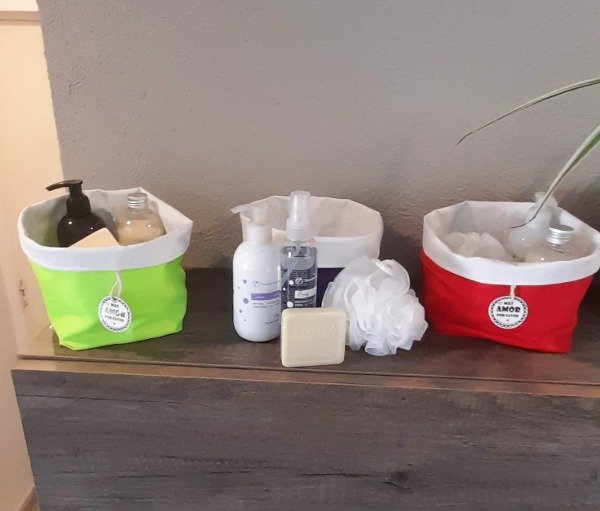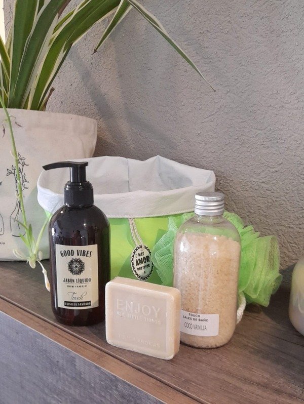 * En contenedor verde manzana con jabón líquido+sales+esponja exfoliante+jabón de tocador.