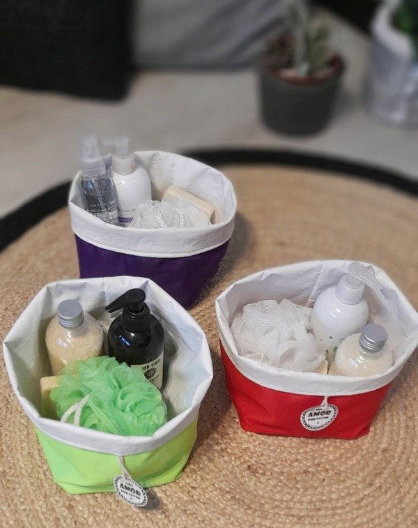 Consta de contenedor eco cuero reversible en color violeta, verde manzana o rojo.