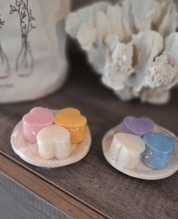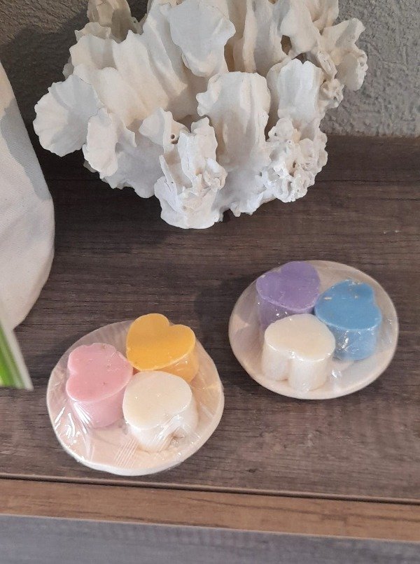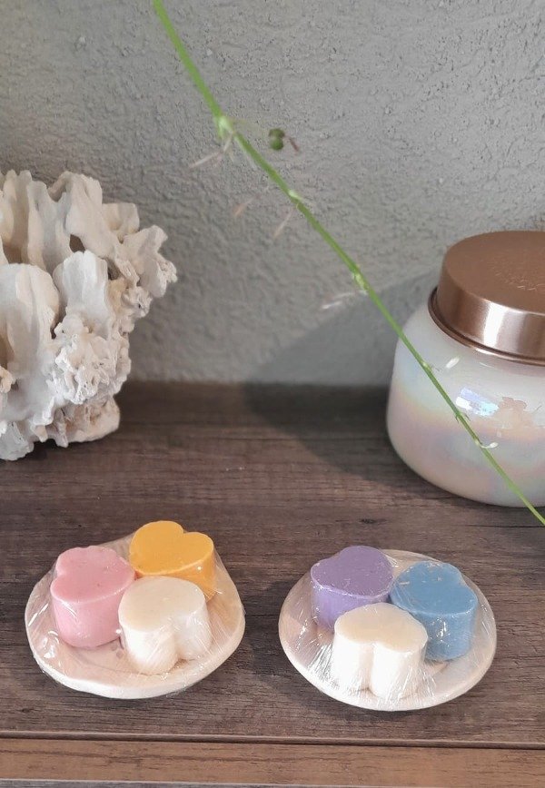 Jabonerita circular en cerámica natural tramada con 3 jabones de tocador en forma de corazones multicolor.