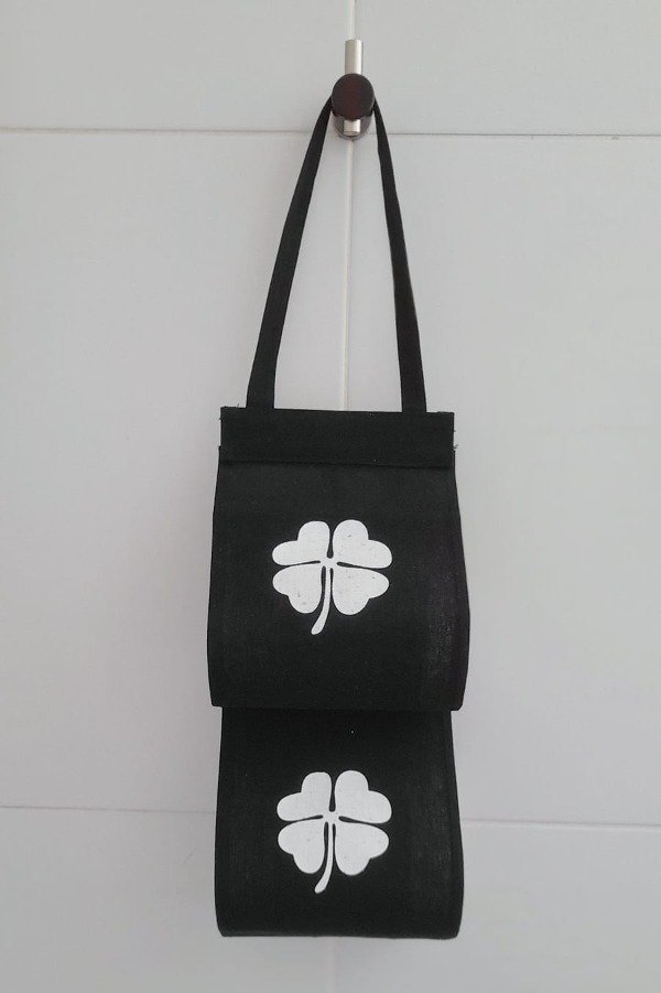De lona impermeable color negro con diseños de tréboles blancos.