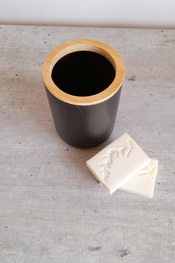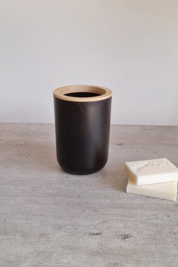 Vaso para cepillos y pasta dental en pet negro con base en bambu.