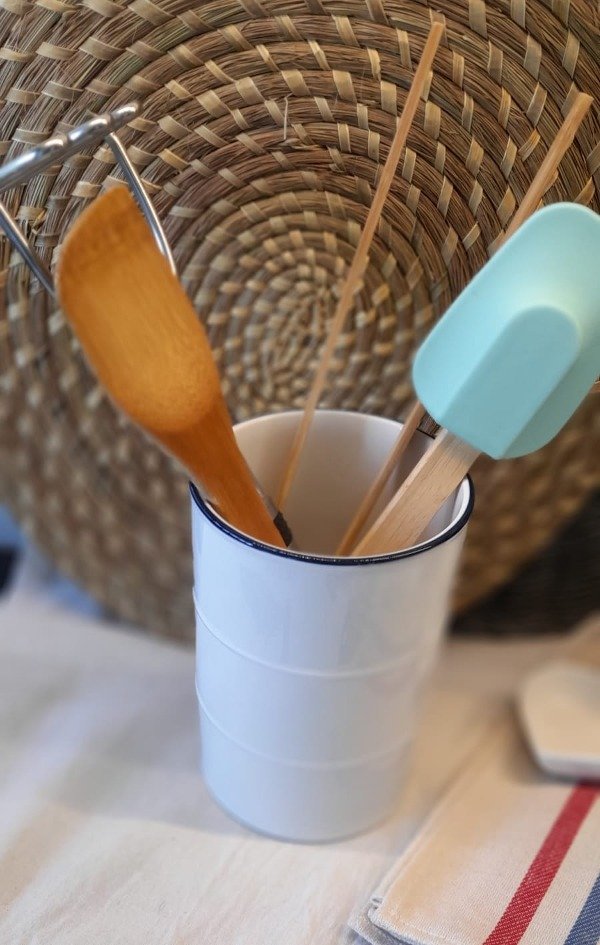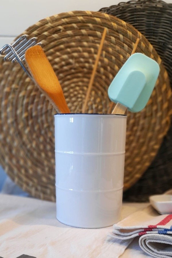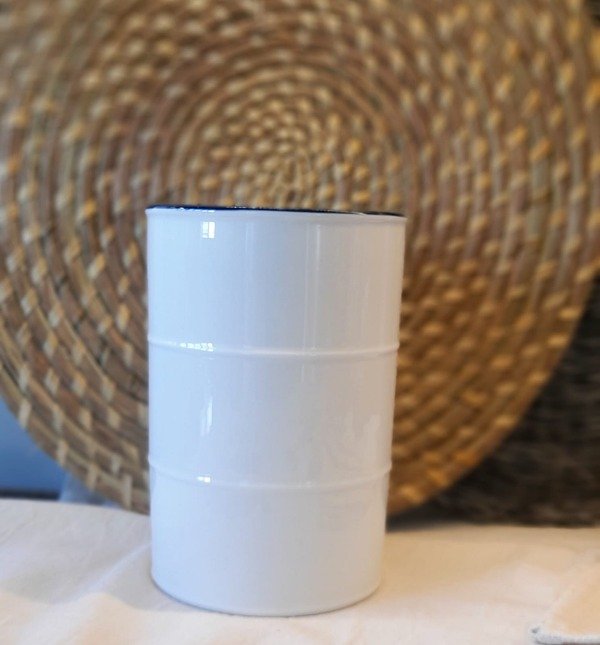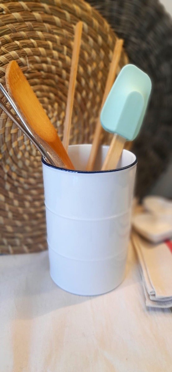 Porta utensillo de porcelana blanca con ribete azul en su base.