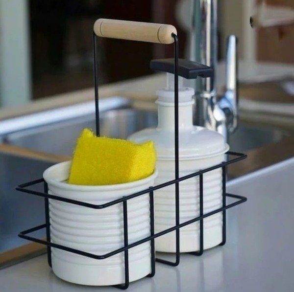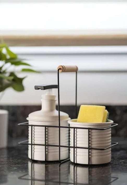 Contiene un detergentero de aluminio pintado en blanco opaco de 500ml con bomba en pet y resina super resistente al agua + esponjero/escurridor blanco.