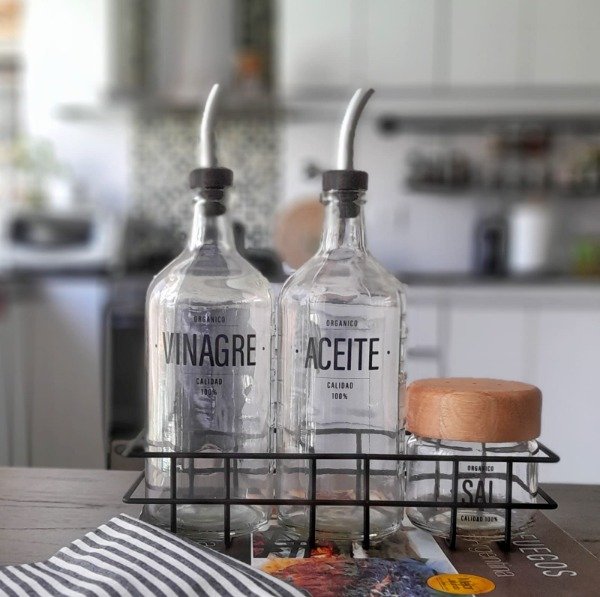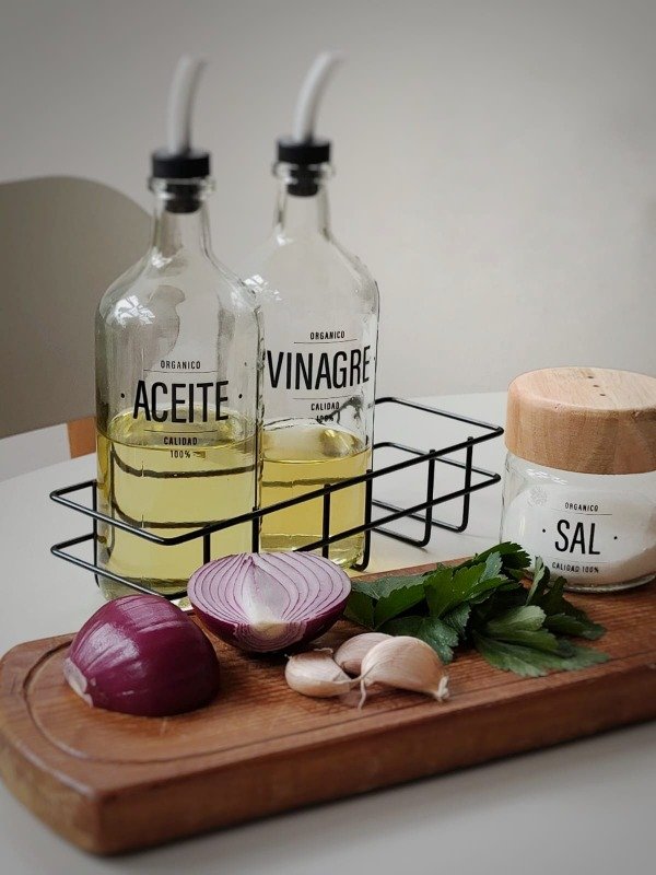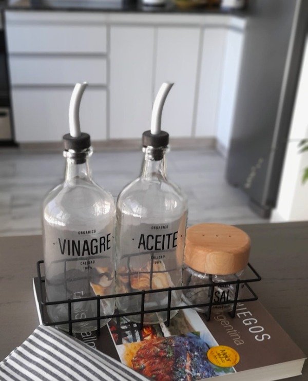 Contiene: un aceitero cristal, un vinagrero cristal de 500cm3 cada uno + un salero de vidrio de 250ml con tapa aluminio revestida en madera.