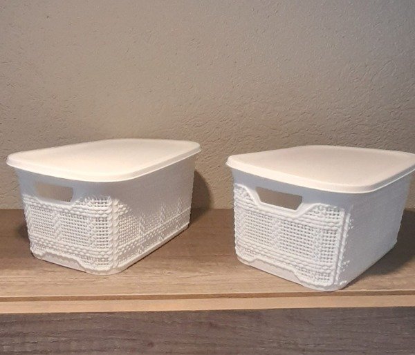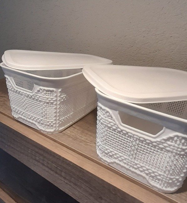 Canasta tramada en color blanco con manija y tapa.