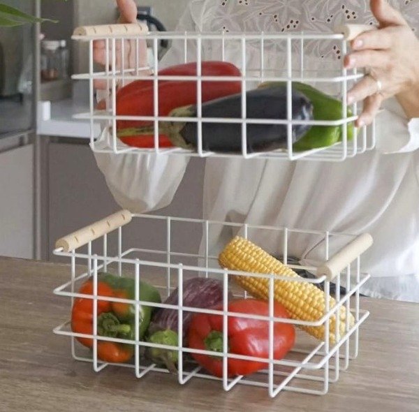 Canasta en metal blanca con agarres laterales en madera.