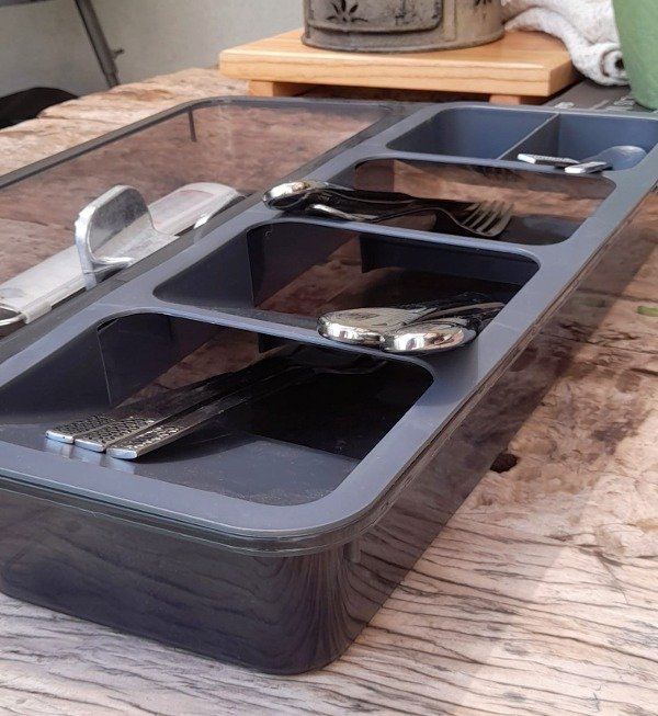 Consta de divisiones para cubiertos en un extremo y en el otro extremo para utensillos varios.